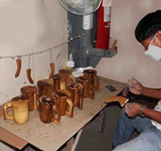 After carving, wooden plaques are forwarded to varnish section. Items are sanded first